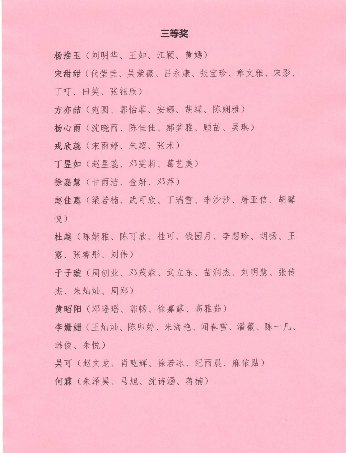 热烈祝贺我院程冬梅、臧宇祺、余乐、谢正宇、胡欣怡、代娇娇、李雯、黄静、徐润妍等275位同学获得奖项,具体获奖名单公示如下: