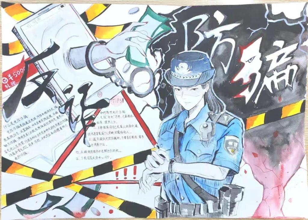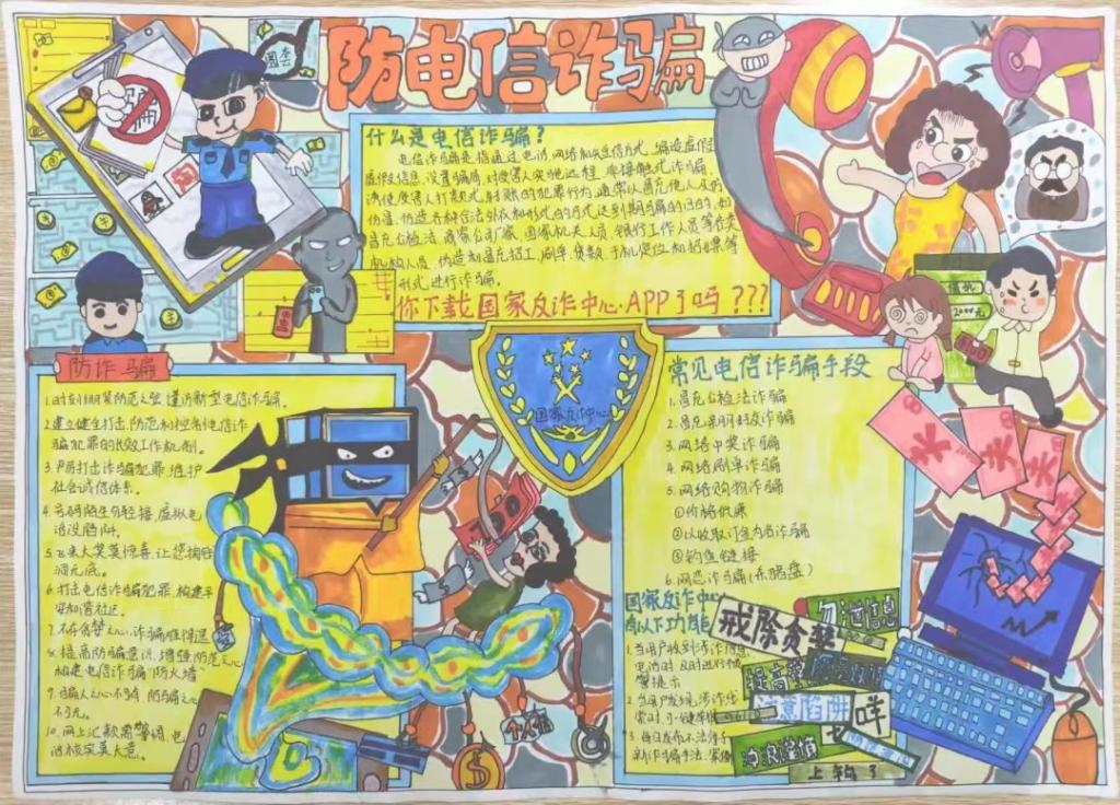 宣传增强防范之心,画纸营造反诈氛围。pa电子官方网站于10月上旬开展“反电诈,防电诈”手抄报活动,我院青年学子积极响应,纷纷投稿,共收到近300件作品。通过团总支微信公众号投票、评委老师打分等多轮选拔,共遴选出18份获奖作品,其中一等奖3名,二等奖5名,三等奖10名。21级学前教育1班华蕾蕾的作品以国家反诈中心标志为原型制作手抄报进行知识宣传,呼吁同学们要做到人人下载安装国家反诈中心APP。22级汉语言文学4班刘嘉诚的作品则通过顺口溜和标语告诫大家要时刻紧绷防范之弦,形式新颖有趣。同学们围绕反电诈、防电诈等相关知识,以独特的视角创作出生动形象、寓意深刻的反电诈手抄报,生动再现了网络诈骗层出不穷的手段及应对方法,有力的唤醒了全院师生反诈骗意识。