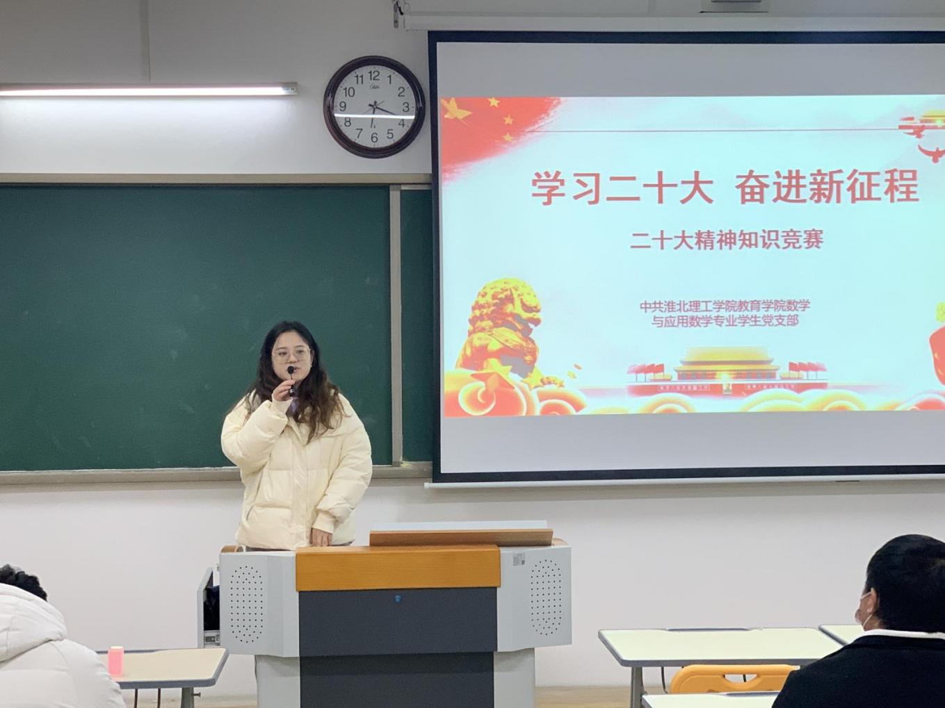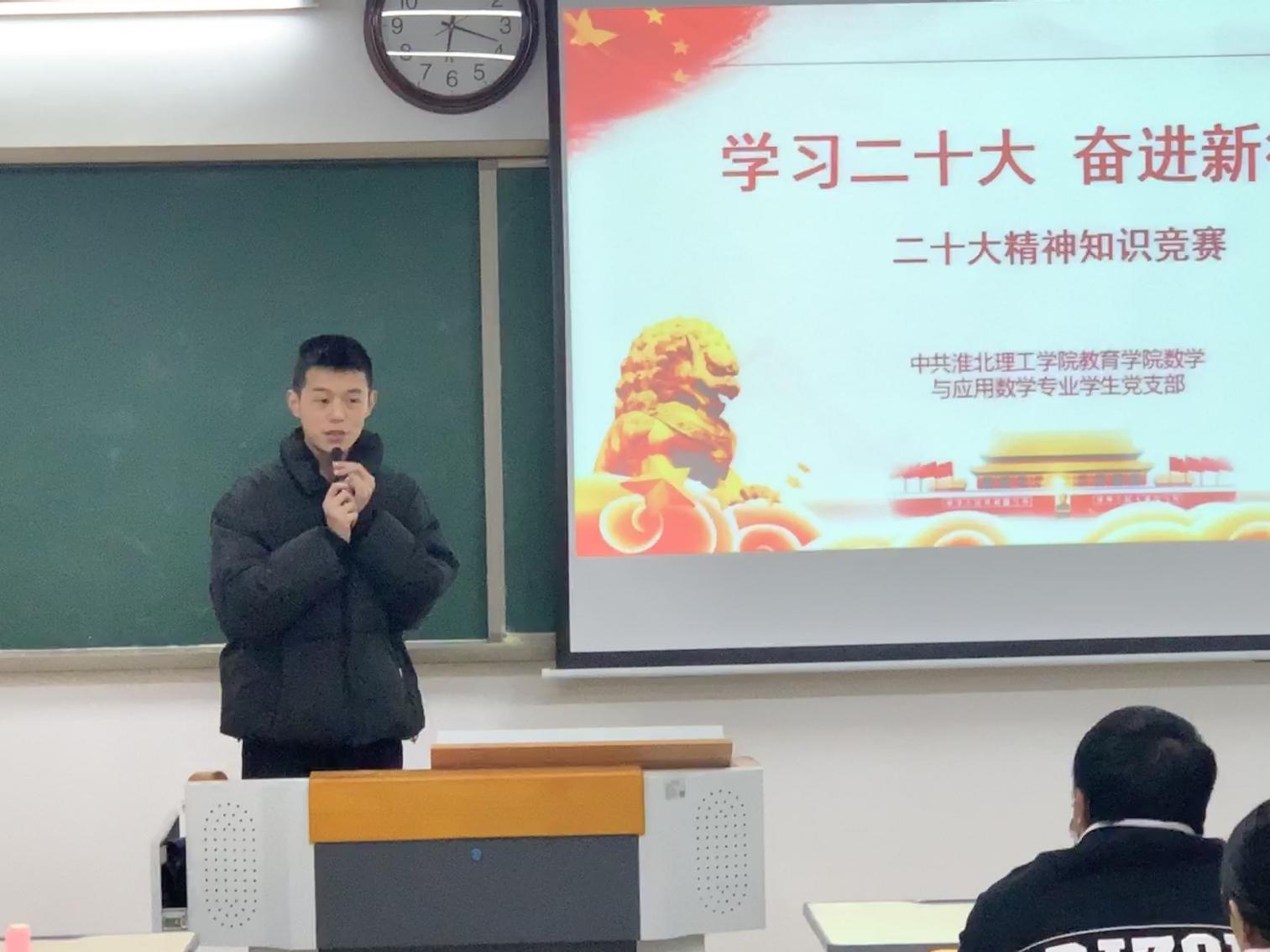 为深入学习宣传贯彻党的二十大精神,回顾党的光辉历史,推动党的二十大精神落地生根、入脑入心。pa电子官方网站数学与应用数学学生党支部积极部署,于12月1日在1教313开展“学习党的二十大精神知识竞赛活动”,活动由支部委员孙虎主持,支部书记陈媛媛、全体支部党员及入党积极分子参加了活动。