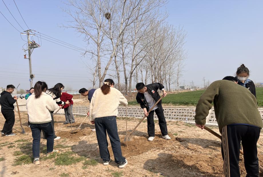 春风浩荡满目新,扬帆奋进正当时。到达目的地后,同学们顾不上休息,扛上树苗、铁锹,提着水桶就开始干了起来。在植树现场,大家热情洋溢,分工明确,团结协作,干劲十足,或两人一组,或三人一群,有的挥锹铲土,有的扶正树苗,有的填土培土,有条不紊地栽培树苗,最后为树苗浇灌河水,期待着它们早日成活,为绿色低碳之城——美丽淮北增添一片新绿。