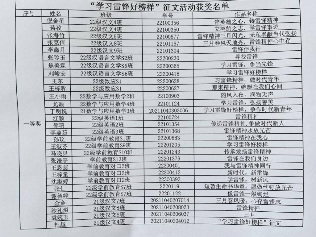 3月上旬,活动一经发出,同学们踊跃报名,积极投稿。学院通过线上线下相结合的方式广泛宣传发动,极大提高了学生参与征文活动的积极性。在征文作品中,同学们从平凡的事迹中发掘雷锋精神的时代特征,字里行间都体会着雷锋精神的深刻内涵。通过他们的文字,公而忘私、热血奉献的螺丝钉精神跃然纸上,透过纯真朴质的语言,更能体现出对雷锋精神的赞扬。本着公平公正的原则,本次征文活动共评选出一等奖19名,二等奖32名,三等奖32名。