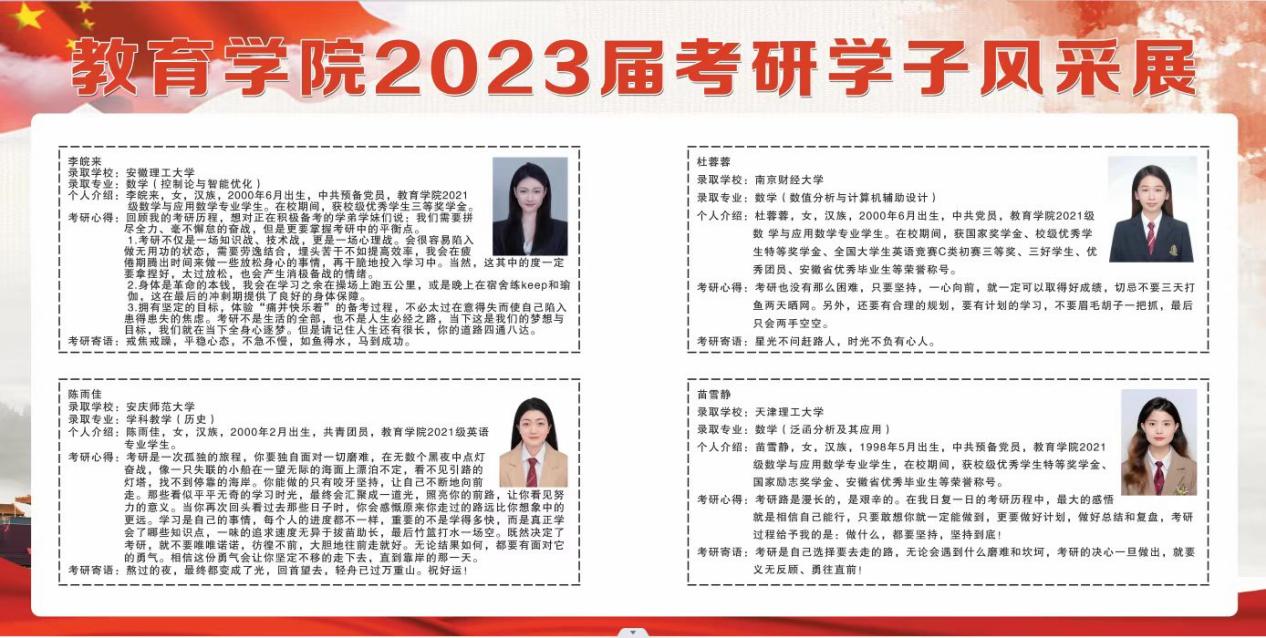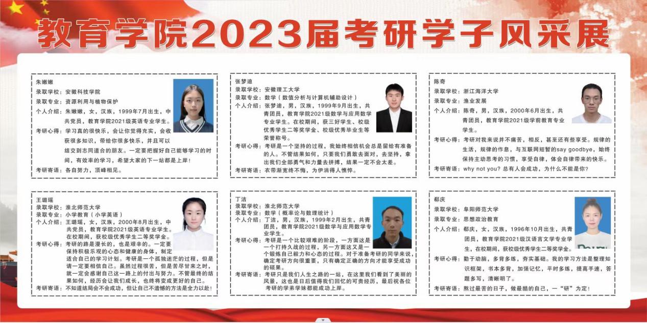 学院在艺术楼一楼大厅张贴考研喜报,设置考研学子风采展板,在祝贺考研同学获得可喜成绩的同时,带动全院学生争优创先,传播校园文化正能量,从而掀起学风建设的新高潮。