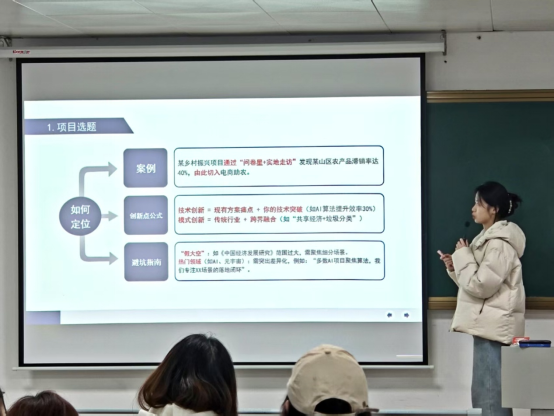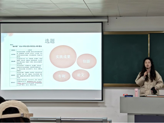 随后,上届“挑战杯”获奖团队代表罗会苏和聂子歆分别为大家分享她们参加“挑战杯”的一些经验和获奖心得。她们从选题思路、团队组建、调研方法、作品撰写到现场答辩等各个环节,分享了自己的实战经验与心得体会。在选题方面,建议同学们从社会热点和自身专业出发,挖掘具有研究价值的课题;团队组建时,注重成员间优势互补,确保团队具备多元化的知识和技能;调研过程中,充分运用问卷调查、访谈等方法,广泛收集数据,为作品提供有力支撑;作品撰写阶段,要逻辑清晰、内容详实,突出创新性和可行性;现场答辩时,注意语言表达和时间把控,以自信从容的姿态展示作品。