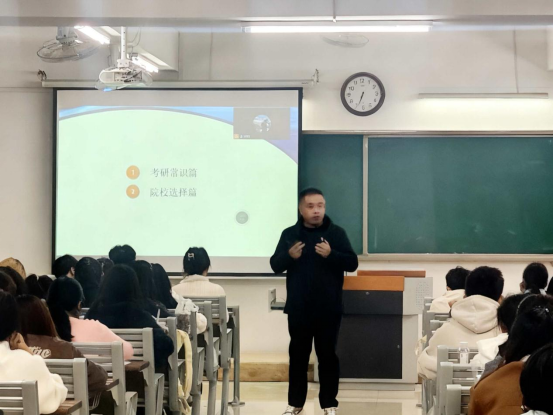 讲座中,牛广涛老师结合当前政策变化对考研形势进行了解读,通过生动的案例让学生对考研形成更深刻的认识。他系统阐述了大学生考研备考规划的方向和重要性,并对不同特点的学生提出考研择校的个性化建议。同时,牛广涛老师还就考研途中常见的困难一一做以答复,引导学生正确选择适合自己的目标院校。现场互动积极热烈,同学们就考研择校和了解备考过程中的疑问与牛老师一一交流,讲座氛围充满热情生动。
