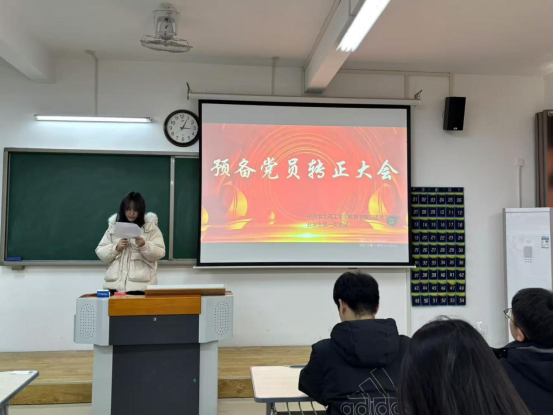 会议伊始,董嘉祺、吴正轩等九名预备党员向支部大会宣读了他们的转正申请,并对过去一年在预备考察期间的思想、学习、工作、生活等各方面进行汇报。入党介绍人介绍该同志在预备期的表现情况及对其按期转正的意见;支部委员会介绍对预备党员预备期间的教育审查情况;与会党员对预备党员能否按期转正发表意见并讨论。随后,支部正式党员进行无记名投票的流程讨论并形成决议。最终,经支部大会讨论和表决,同意董嘉祺、吴正轩等9名预备党员按期转为中共正式党员。