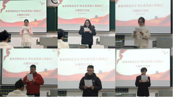 2025级汉语言文学专升本5班的学生党员李晓楠在发言中表示,党员就是班级的“稳压器”,得让大家觉得“有靠头”,不当“喊口号的党员”,要做“能扛事的普通人”。2025级汉语言文学专升本3班的学生党员韦丽在发言中表示:要把“党员”这两个字当成“标尺”,别人有需要时会第一个先站出来,成为一个“靠谱”的党员,成为一个被值得信任的党员。2025级英语专升本1班的学生党员葛越越认为:作为学生党员需立足个人特长,结合自身学习成长与党员身份,在知识传递、文化沟通、服务他人中践行使命。2025级汉语言文学专升本4班的学生党员徐庆发言中谈到:党作为国家与人民最有革命性和先进性的掌舵者,带领着中国人民跨越一波又一波惊涛骇浪,使我们平稳地航行在初步实现社会主义现代化的伟大航程上。我们作为党的新鲜血液,虽然现在还身处校园,但要在日常实践中坚持提升自我、在团结同学中把握方向,不断保持自我革命,促进个人成长,以党员的标准严格要求自己,做到思想不懈怠、工作不变质。