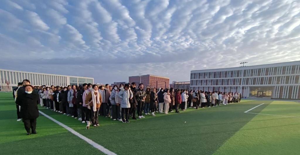 随后,国旗护卫队迈着整齐有力的步伐,护卫着五星红旗,在雄壮的义勇军进行曲中,走向升旗台。在豪迈的国歌声中,鲜艳的五星红旗冉冉升起。全体师生肃然静立,凝眸注视,表达对祖国的崇高敬意。