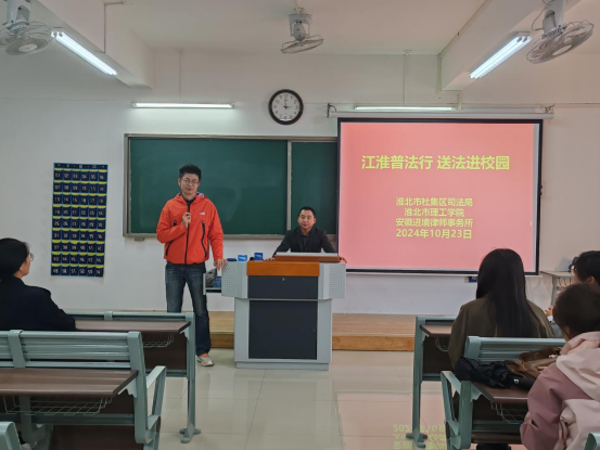 为不断深化普法教育,增强学生们的法律意识和自我保护能力,推动建成和谐、安全的校园环境。10月23日下午,pa电子官方网站和淮北市杜集区司法局、安徽进境律师事务所携手于1教421开展“江淮普法行·送法进校园”主题活动。本次活动由pa电子官方网站教工第二党支部书记刘畅主持,安徽进境律师事务所合伙人孟春江律师主讲,杜集区司法局普法办主任张丽丽,司法局人民参与和促进法治办主任周立业,杜集区法律援助中心主任赵义玉参与。