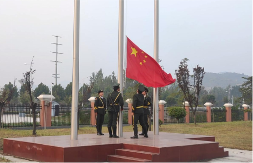 国歌嘹亮,国旗飘扬。国旗护卫队迎着东方的晨曦,迈着矫健整齐的步伐走向升旗台,鲜艳的五星红旗冉冉升起。全体师生肃立注目,面向五星红旗行注目礼。
