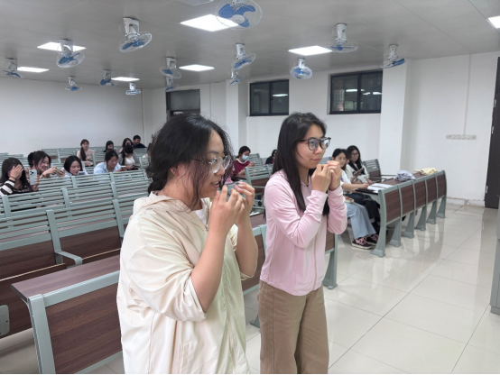 比赛现场气氛热烈,各教室参赛队伍早早到场进行赛前准备。随着主持人宣布比赛开始,选手们迅速进入状态。根据比赛规则,猜词者背对PPT,两名表演者面向PPT,以特定的展位准备迎接挑战。表演者在看到题目后,仅能说出题目类型,通过生动形象的肢体动作、丰富夸张的表情,将题目信息传递给猜词者。过程中,大家全神贯注,严格遵守“禁止语言暗示、场外提示”等规则,凭借默契配合展开激烈角逐。