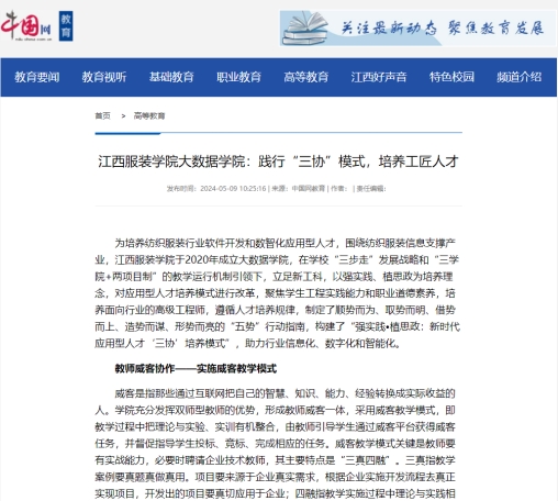 为培养纺织服装行业软件开发和数智化应用型人才,围绕纺织服装信息支撑产业,bat365中文官方网站于2020年成立bat365中文官方网站,在学校“三步走”发展战略和“三学院+两项目制”的教学运行机制引领下,立足新工科,以强实践、植思政为培养理念,对应用型人才培养模式进行改革,聚焦学生工程实践能力和职业道德素养,培养面向行业的高级工程师,遵循人才培养规律,制定了顺势而为、取势而明、借势而上、造势而谋、形势而亮的“五势”行动指南,构建了“强实践•植思政:新时代应用型人才‘三协’培养模式”,助力行业信息化、数字化和智能化。