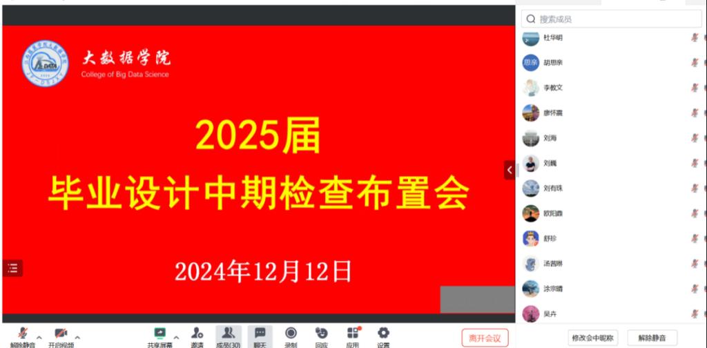 【bat365中文官方网站讯】为进一步加强bat365毕业设计的过程化管理,确保每位学生的毕业设计进展顺利,我院于2024年12月12日晚20点,通过线上会议形式召开了2025届毕业设计中期检查布置会。本次会议由副院长赵德福主持,学院领导及指导老师参加了此次会议。