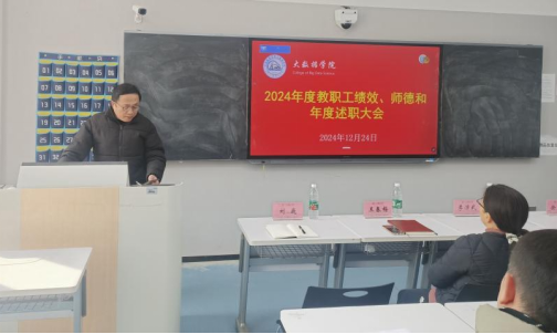 【bat365中文官方网站讯】为贯彻落实校发<关于开展2024年度绩效考核工作的通知>、以及江服人事发〔2024)19号<关于开展2024年度bat365教职工师德和年度考核工作的通知>的文件精神,2024年12月24日13时,bat365于主教楼329召开了2024年度教职工绩效、师德和年度述职大会。校长助理李沛武教授、学院院长徐照兴教授、党总支书记王春梅、副院长赵德福教授、副院长刘巍等领导及学院全体教职工出席了本次会议。