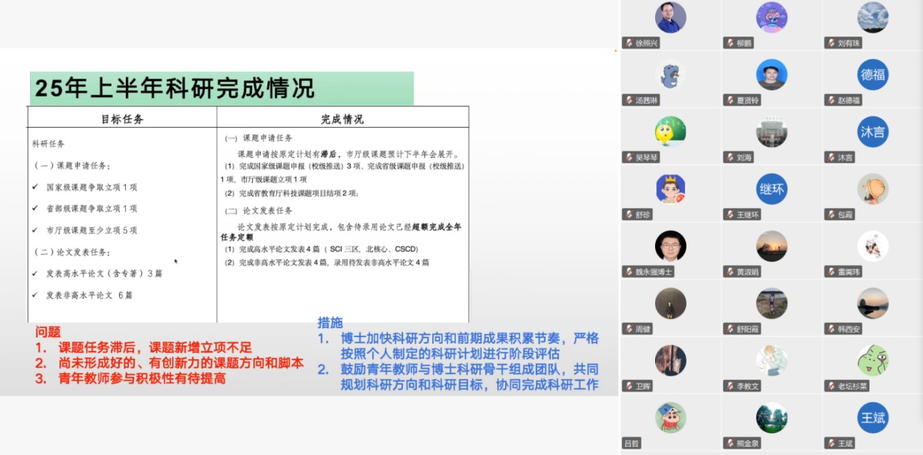 随后,副院长刘巍聚焦科研、学科竞赛等工作,回顾了本学期在论文发表、专利获批、成果转化、学科竞赛等方面取得不错的成绩,然后指出当前存在的课题任务滞后、新增立项不足、创新方向薄弱以及青年教师参与积极性不高等问题,提出针对性举措。他鼓励博士加快科研方向和前期成果积累,严格按计划进行阶段评估;引导青年教师与博士科研骨干组队,协同完成科研任务。对于下半年科研工作,他强调要强化高层次人才科研管理,推动年初规划任务达成,积极筹备重点高水平基金课题申报,并精心组织重点赛事参赛工作,以赛促学、以赛促研,激发学院科研创新活力。