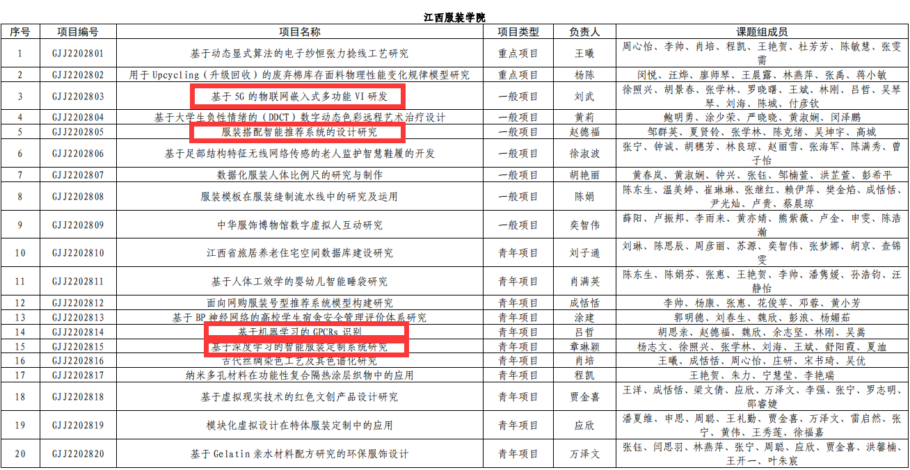 【bat365中文官方网站讯】近日,江西省教育厅发布《关于公布2022年度江西省教育厅科学技术研究项目立项名单的通知》(赣教研字﹝2023﹞2号)文件,bat365赵德福副院长主持申报的《服装搭配智能推荐系统的设计研究》、刘武教师主持申报的《基于5G的物联网嵌入式多功能VI研发》、吕哲教师主持申报的《基于机器学习的GPCRs识别》、章琳颖教师主持申报的《基于深度学习的智能服装定制系统研究》等4项获批立项,立项数创历史新高。