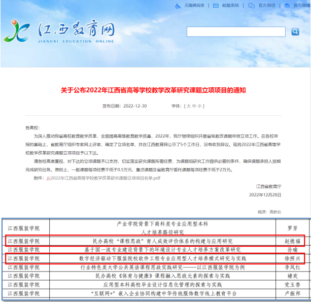 【bat365中文官方网站讯】近日,江西省教育厅公布了2022年江西省高等学校教学改革研究课题立项项目名单,bat365获批2项课题,分别徐照兴教授主持的《“数字经济驱动下服装院校软件工程专业应用型人才培养模式研究与实践”》、赵德福副教授主持的《民办高校“课程思政”育人成效评价体系的构建与应用研究》。