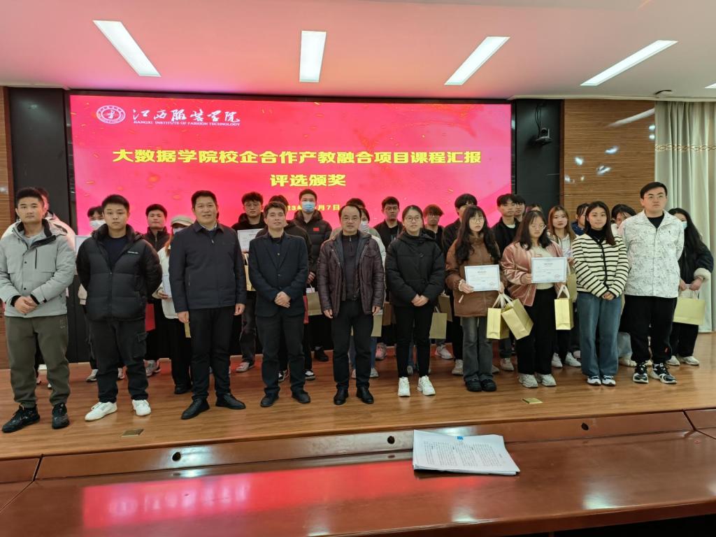 项目课程汇报结束后,于2023年11月7日下午,bat365在行政楼报告厅举行了校企合作产教融合项目课程汇报的评选颁奖大会,从三个班共计19个组中选取出一等奖1名、二等奖2名、三等奖3名以及优胜奖4名,并对获奖小组的所有成员颁发奖品。参与本次颁奖仪式的人员有学院院长徐照兴、副院长赵德福、教研室主任吴琴琴、企业导师、及各班教师和全体学生。在颁奖结束之后,全体参会人员进行合影留念。