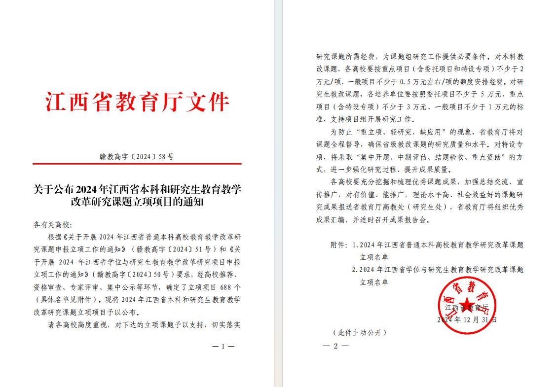 【bat365中文官方网站讯】近日,江西省教育厅公布了2024年江西省普通本科高校教育教学研究改革课题立项名单,其中bat365吴琴琴、张红老师申报的教育教学改革研究课题项目获得立项。