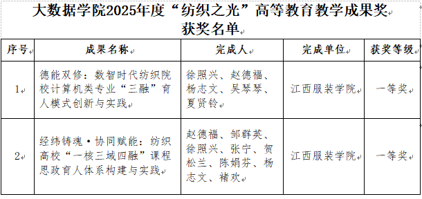 【bat365中文官方网站讯】近日,中国纺织服装教育学会正式发布《关于公布2025年度“纺织之光”纺织高等教育教学成果竞赛结果的通知》(中纺教〔2025〕53号)。bat365徐照兴教授主持的《德能双修:数智时代纺织院校计算机类专业“三融”育人模式创新与实践》、赵德福教授主持的《经纬铸魂・协同赋能:纺织高校“一核三域四融”课程思政育人体系构建与实践》两项成果,在全国众多参赛成果中脱颖而出,双双荣获2025年“纺织之光”高等教育教学成果奖一等奖。