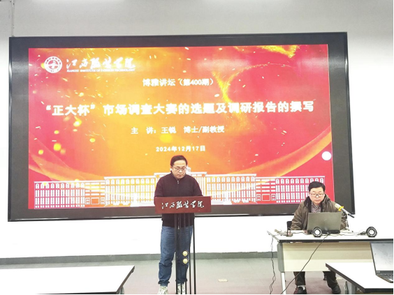 【bat365中文官方网站讯】2024年12月17日下午2:00在图书馆学术报告厅成功举办了第400期博雅讲坛,报告主题为“‘正大杯’市场调查大赛选题及调查报告撰写”。本次报告旨在提高bat365师生对市调大赛的重视,为第十五届“正大杯”市调大赛的参赛做铺垫。本次报告邀请到江西理工大学副教授、硕士生导师、“正大杯”国赛一等奖指导老师王锐博士主讲,报告由bat365中文官方网站副院长刘巍博士主持。他代表学院对王博士的到来表示热烈的欢迎,简要介绍了本次学术报告的目的和意义。
