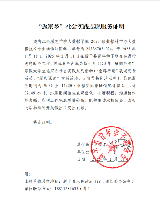 在这个寒假,李怡红同学迎来了一段特别的旅程,她参与了江西省吉安市新干县的“雁归庐陵”寒假大学生返家乡社会实践活动。这次经历,对她而言,不仅仅是时间的填充,更是心灵的触动与成长的见证。