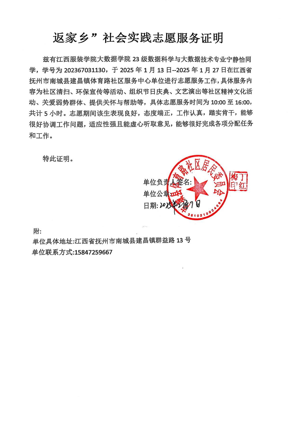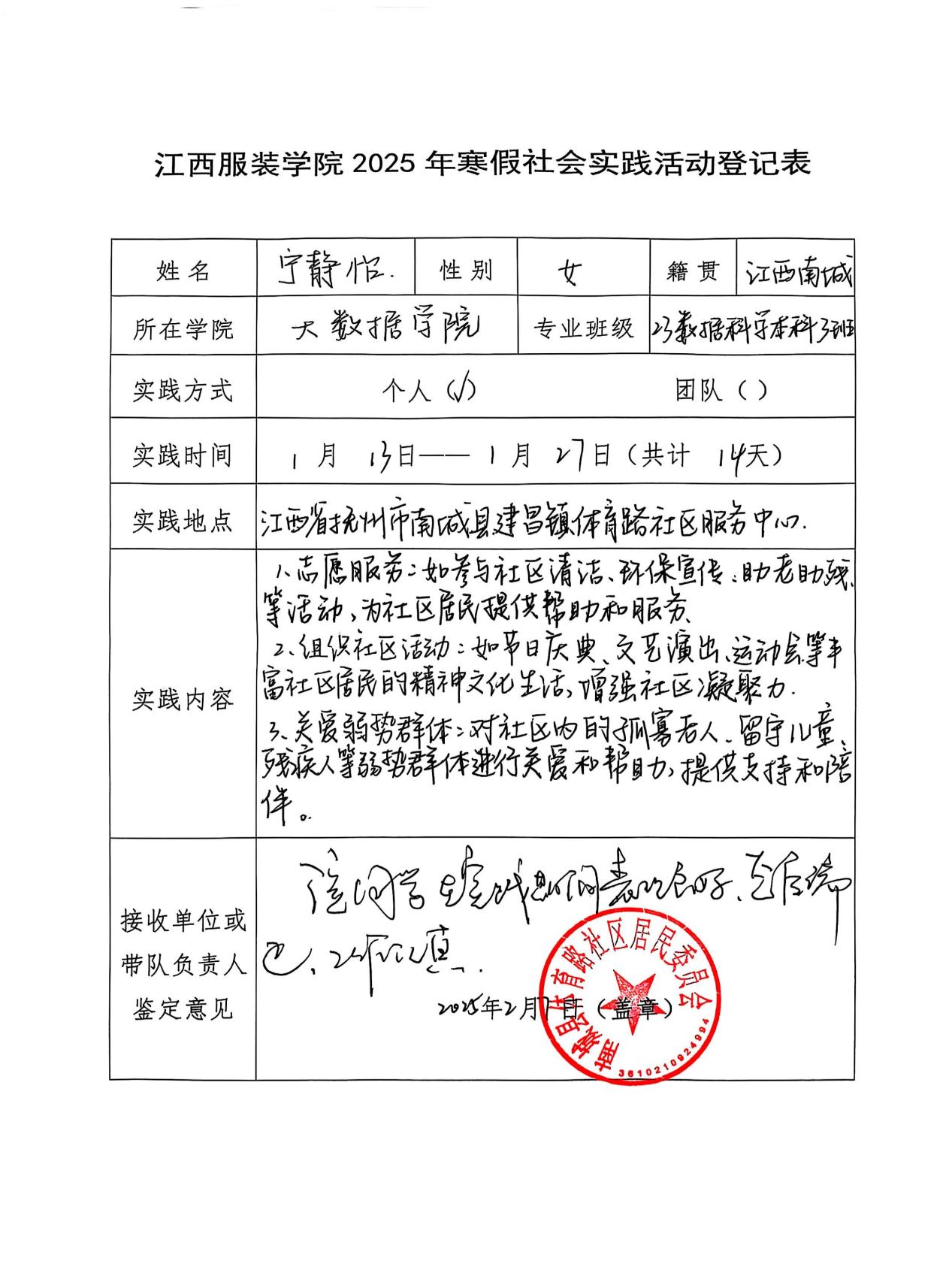 寒假期间,青年学子宁静怡积极参与bat365中文官方网站“返家乡”活动,回到家乡江西省抚州市南城县建昌镇体育路社区,开展了为期一个月的实践活动。她满怀热忱投入社区事务,无论是清洁环境、关爱弱势群体,还是组织多彩活动,都亲力亲为,用实际行动诠释青年担当,踏上自我成长的奋进之路。