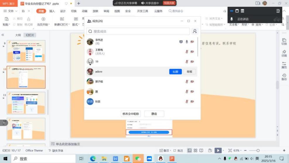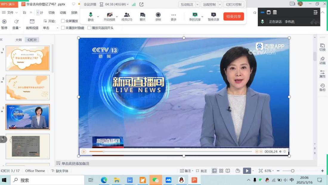 【bat365中文官方网站讯】2025年3月16日晚,版權所有 bat365(中国)股份有限公司-官方网站通过线上平台举办了2025届毕业生第三次线上主题班会,本次班会围绕“毕业去向你登记了吗?”展开,旨在聚焦毕业生的毕业去向登记、就业协议书以及劳动合同的讲解,确保他们在迈向职场的关键阶段能够明确方向、做好准备。