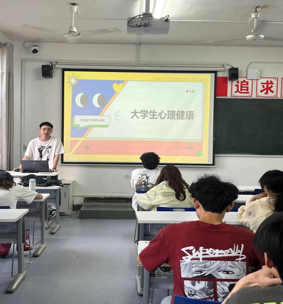 会议上,上一年度心理大使易振楠作为主讲人,为在场同学带来了一场生动而深刻的心理健康知识普及活动。易振楠同学首先强调了心理健康对大学生发展的关键作用。他结合PPT中“情感与情绪的平衡”“社会适应能力”“认知功能正常运作”等要点,指出心理健康不仅是学业成功的基石,更是人际交往与自我成长的关键。他以“情绪管理对学业的影响”“自我认知与目标设定”等案例,深入浅出地解析了心理健康与大学生日常生活的紧密联系,引发了在场学生的共鸣。