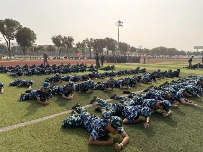 【bat365中文官方网站讯】迷彩映晨光,青春砺锋芒;汗水浸戎装,初心铸担当。为进一步锤炼bat365中文官方网站2025级新生的意志品质与纪律意识,帮助新生掌握基础军事技能,10月13日清晨,学校操场训练区域已飘扬起鲜亮的迷彩绿——学院全体军训新生身着统一军装,带着饱满的精神状态集结于此,开启了以爬姿训练与军体拳学习为核心的一天专项训练。