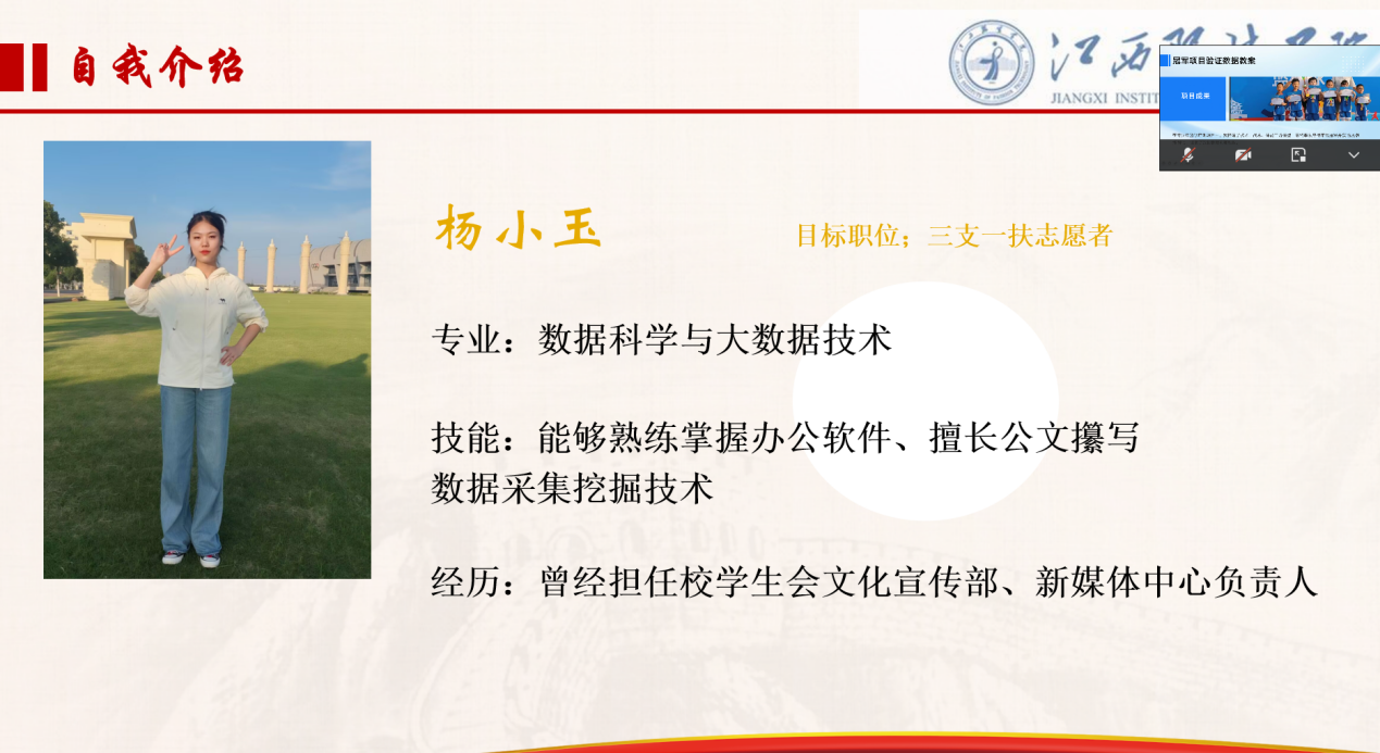 杨小玉同学怀揣着一颗感恩的心,以“三支一扶”志愿者为目标,重点介绍自身具备的专业技能、服务精神、社会服务等匹配目标职业的能力,以及通过学业成绩、所获证书和实践经历表达自己想要服务基层的决心。