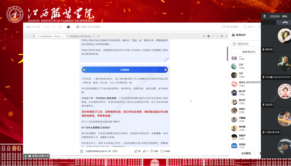 会上,还特别邀请了优秀校友韦平先生进行就业经验分享。韦先生结合自己的就业经历和工作心得,向毕业生们传授了宝贵的就业经验和职场感悟。校友的分享生动而具体,让毕业生们受益匪浅。