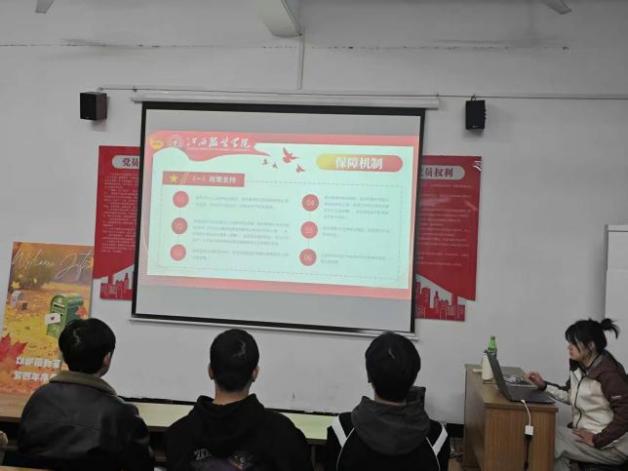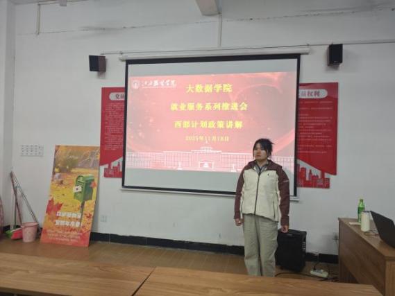 “服务期1至3年,协议一年一签,服务期间可享受生活补贴、艰苦边远地区津贴及综合保障险,服务期满后考公、考研均有加分政策。”李萍老师通过PPT展示了保障机制的具体内容,包括学费补偿、就业创业扶持等政策,同时结合学校往年西部计划志愿者的服务案例,让学生直观了解项目的实践价值。