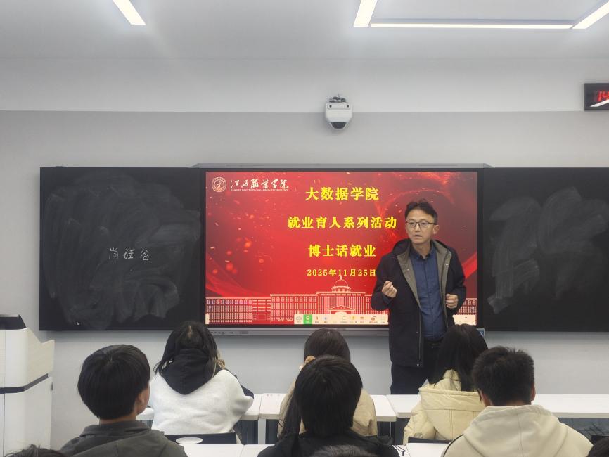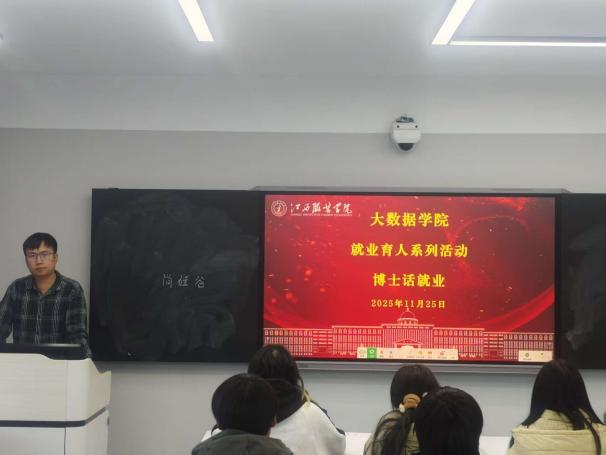 【bat365中文官方网站讯】2025年11月25日下午15:00,版權所有 bat365(中国)股份有限公司-官方网站在主教楼316教室开展以“博士话就业”为主题的就业指导讲座,旨在让学生明晰AI时代下就业市场的趋势,更好选择自身职业路径、适应市场变化。学院王继环、张川两位博士分别为同学们带来行业干货,在现场以数据、案例与实操方案构建起就业指引体系。