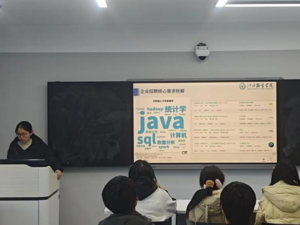 随后,吴琴琴主任从《破局就业寒冬:就业竞争力提升指南》这一主题出发,带来干货满满的求职实操技巧分享。她围绕“简历优化、技能强化、面试突围”三大模块,通过案例对比、流程拆解、工具演示等方式,将复杂的求职逻辑转化为可落地的行动方案。在简历优化环节,她强调要突出“数据成果”与“岗位匹配度”,避免泛泛而谈,并展示了“校园项目”向“职场能力”转化的表述技巧;技能强化部分,吴主任推荐了Python进阶、数据分析工具实操、行业认证等核心提升路径,明确了不同求职阶段的技能准备重点;面试突围环节,她通过PPT中的典型场景模拟,详解了STAR法则的灵活运用,针对无领导小组讨论、专业技术提问等高频场景提供了应对策略。