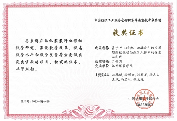 【bat365中文官方网站讯】9月12日,中国纺织工业联合会公布了《关于授予“纺织之光”2023年度中国纺织工业联合会纺织高等教育教学成果奖的决定》,bat365共获奖2项,其中特等奖1项,二等奖1项,创历史新高。